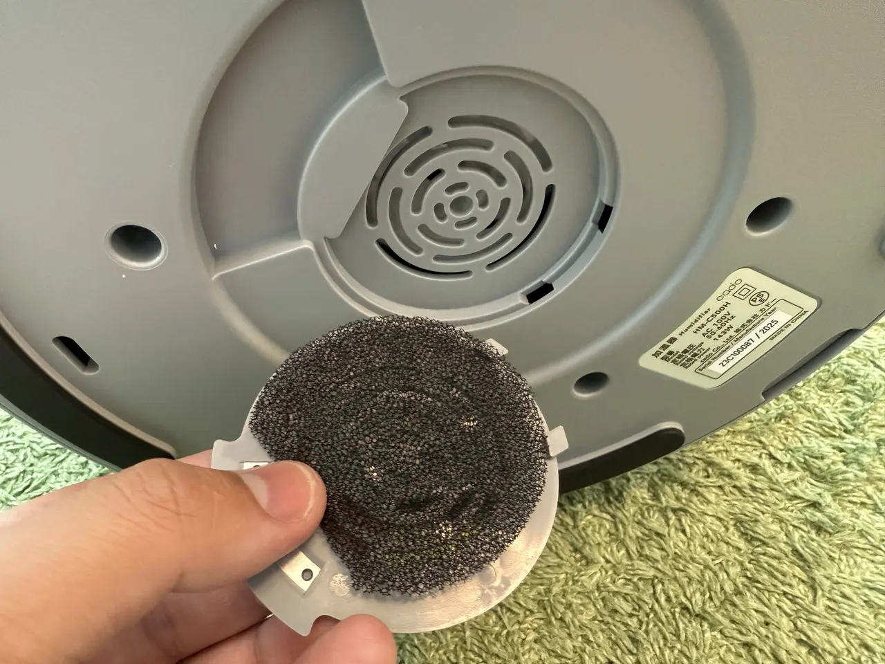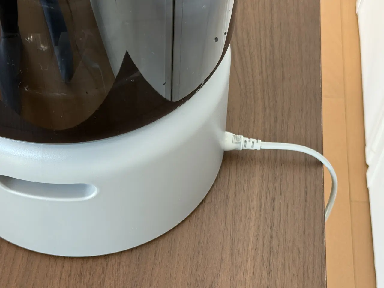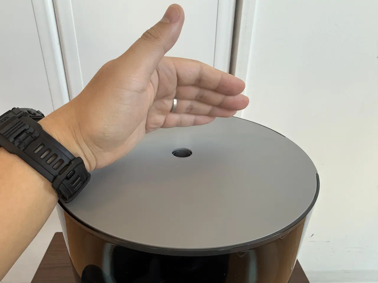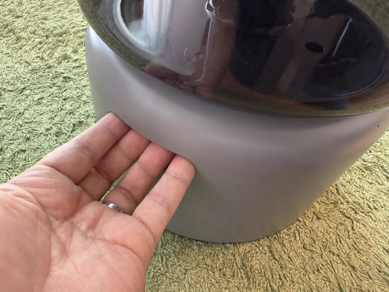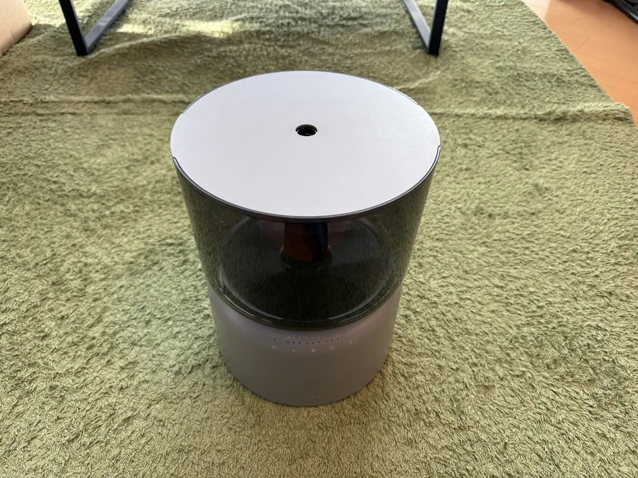 そして数秒後には、上部のノズルから水蒸気が立ち上がりはじめます。ミストは非常にきめ細かく、目視で確認できる一方で触れてもほとんど熱を感じません。スチーム式のような熱気や勢いではなく、空気にすっと溶け込むように広がっていく(拡散していく)印象です。