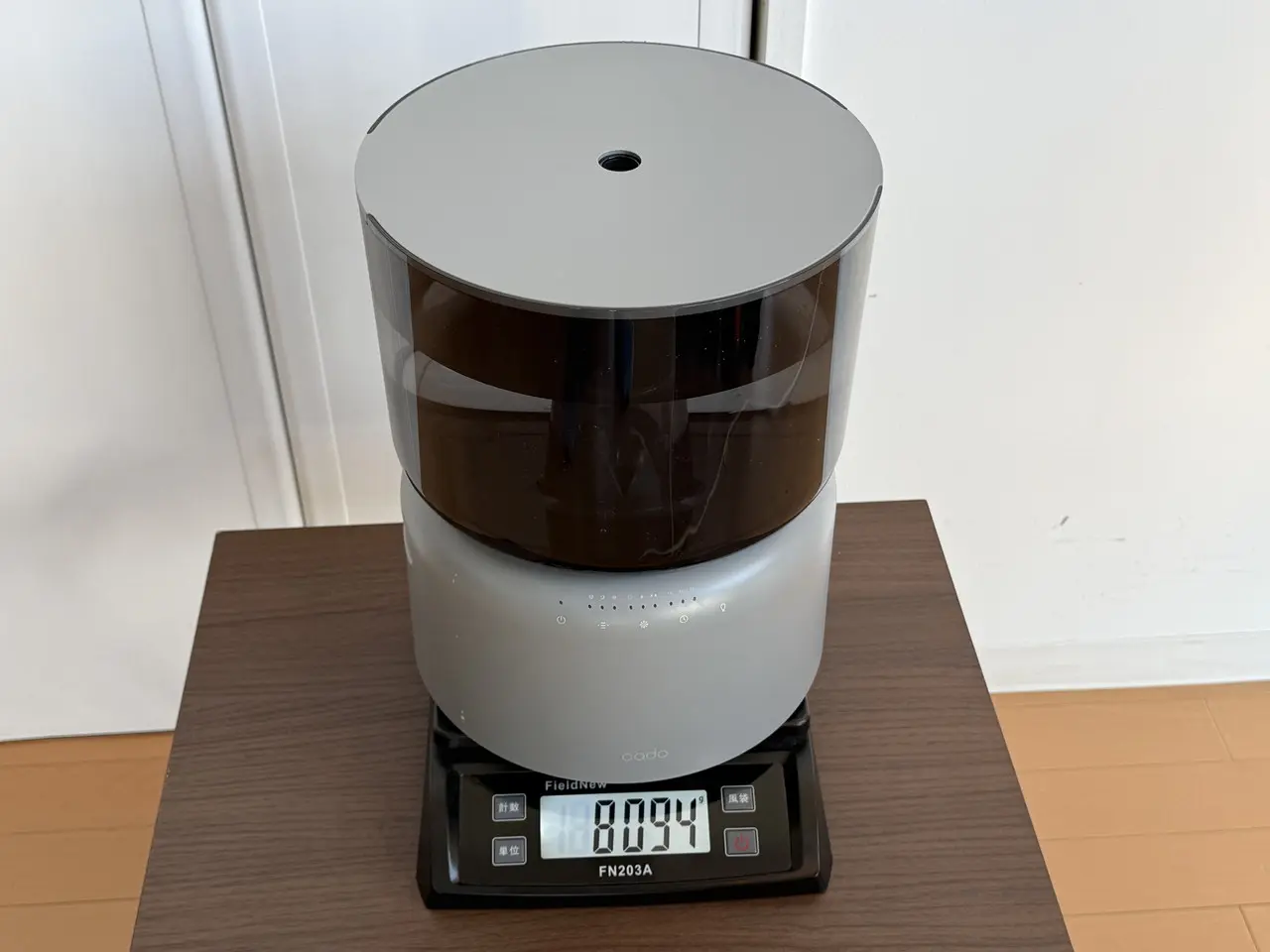 ちなみに、MAX線まで給水した状態の加湿器の全体重量は、実測で約8.1kg。持ち運び時にややずっしり感はあるものの、その分しっかりとした安定感があり、使用中に倒れる心配はありません。