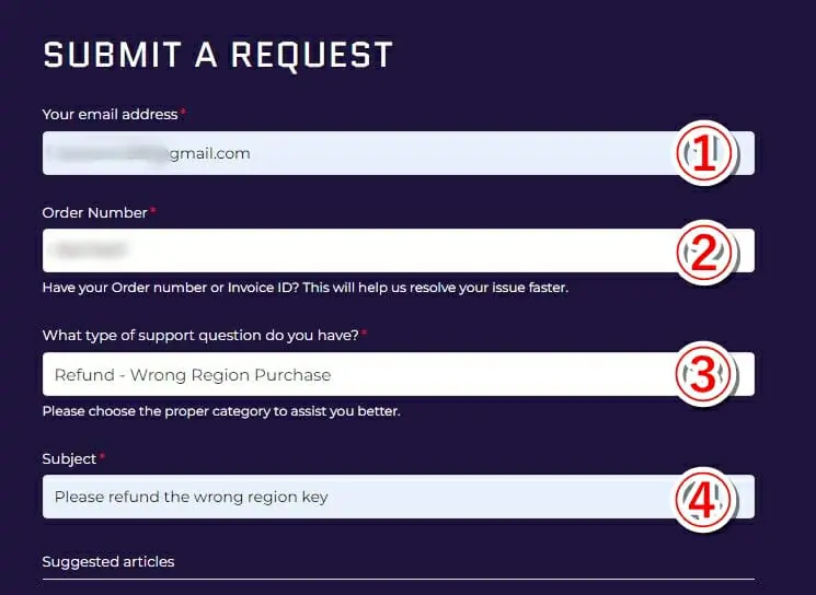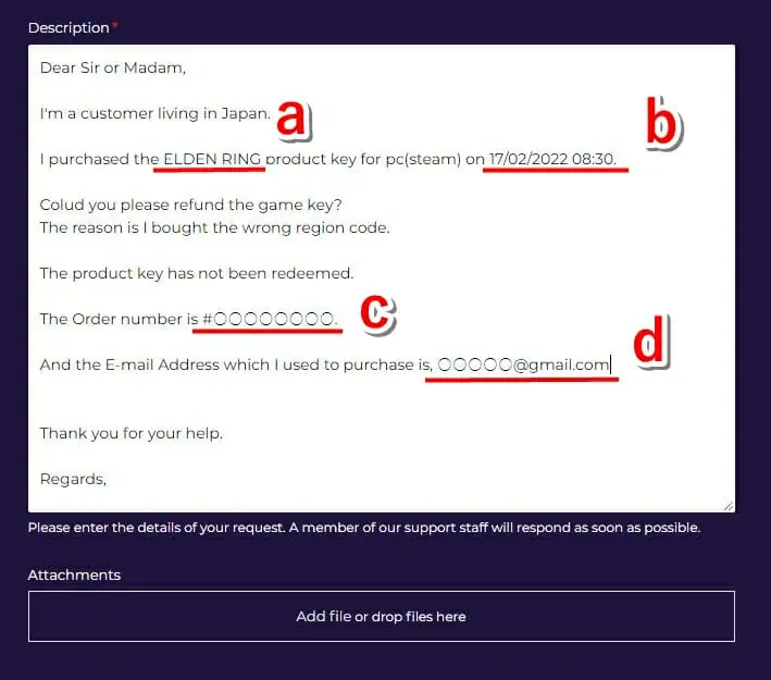 下線d の部分は、返金したいゲームキーを購入したアカウントのメールアドレスを入力してください。