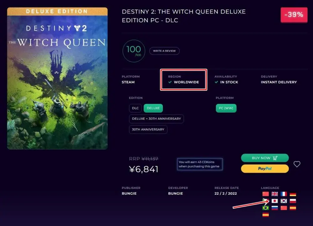 CDKeysでは基本的に、ゲームキーのリージョン(REGION)が "WORLDWIDE(世界中)" になっており、かつ対応言語に "日本語" が含まれている場合は、日本のアカウントでもキーを有効化することが出来ます。