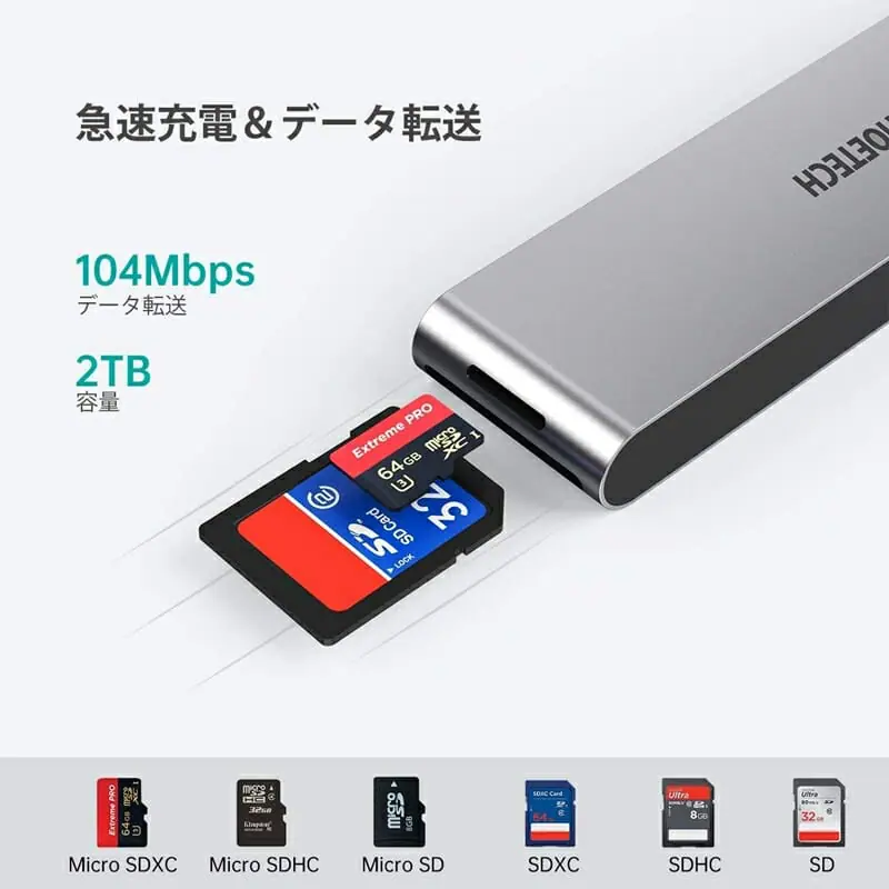 ▼そして反対側の先端には『Micro SD( TF)カードリーダー』と『SDカードリーダー』が用意されており、MicroSDカードとSDカードの挿入が可能。