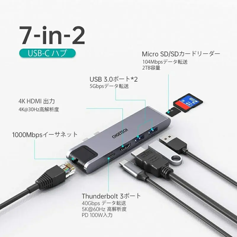 そこで今回オススメするのが、Macbook Pro, MacBook Airの2つのUSB Type-Cポートを、7つもの多彩なポートに拡張することのできる『CHOETECH 7-in-2 USBハブ』だ。