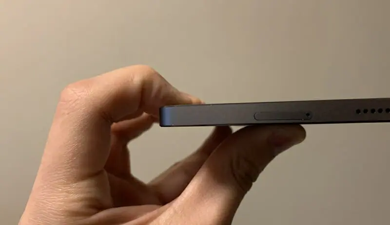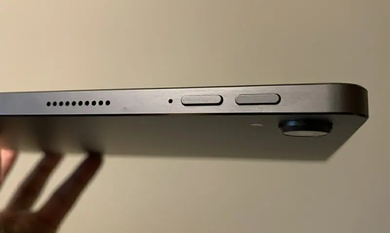 ▼本体右側。画像左から『スピーカー穴』『リセット穴』『音量調節ボタン』が搭載。