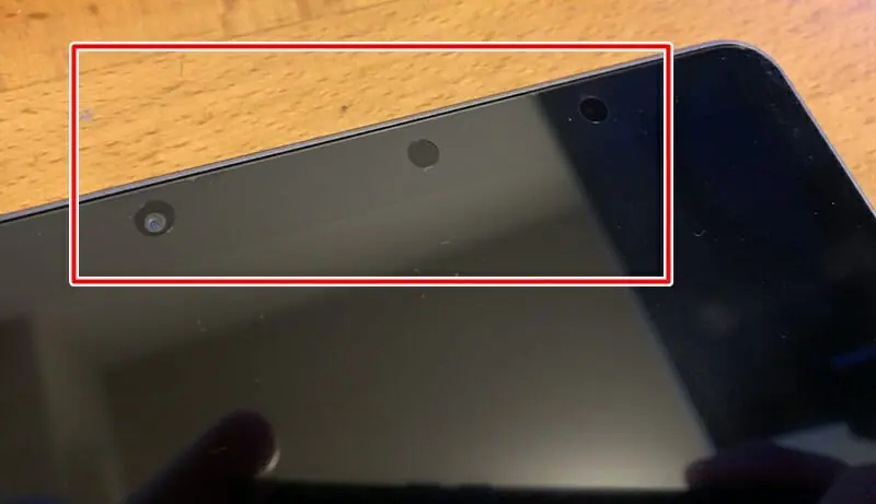 ▼ディスプレイ前面には、5メガピクセルの『フロントカメラ』や関連センサー類が搭載されている。
