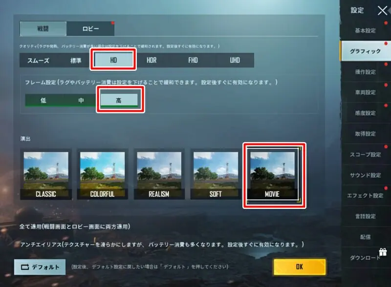 最初のグラフィック設定では、HDクオリティまでを選択することが可能であった。