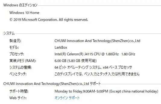 『CHUWI LarkBox』のOSはWindows10(Home)が搭載されており、起動すると通常のPCと同じくセットアップ画面から開始される。