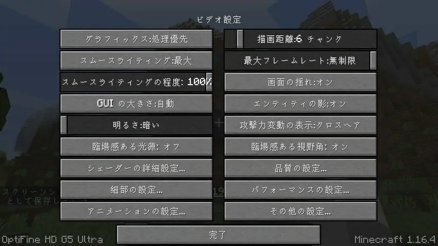 ▼設定は処理優先、描画距離は6チャンクほどに抑えてある。