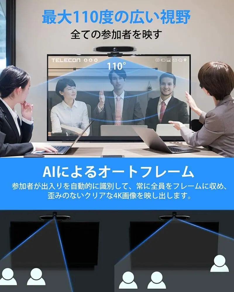 人工知能AI技術を搭載しており、会議参加者が出入りすることを自動的に識別し、常に全員をフレームに収め歪みのないクリアな4K画像を映し出しすことが出来ます。