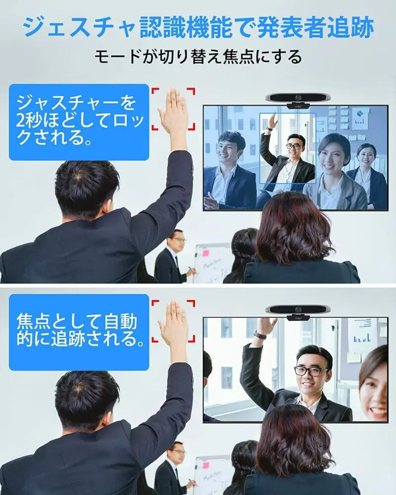 そしてカメラにはAI機能が搭載されており、ヒトの動きを認識して、発言者を自動的に強調表示することができます。