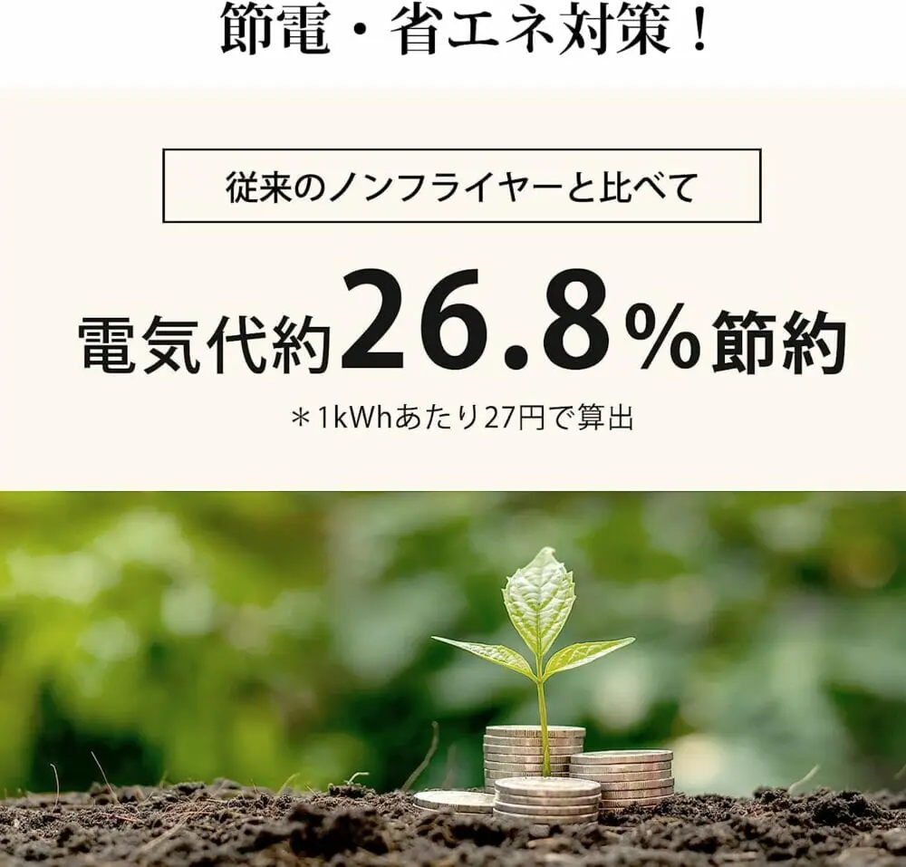 そして従来のノンフライヤーと比べて電気代が約26.8%節約でき、節電・省エネ対策の面でも優れたモデルとなっている。