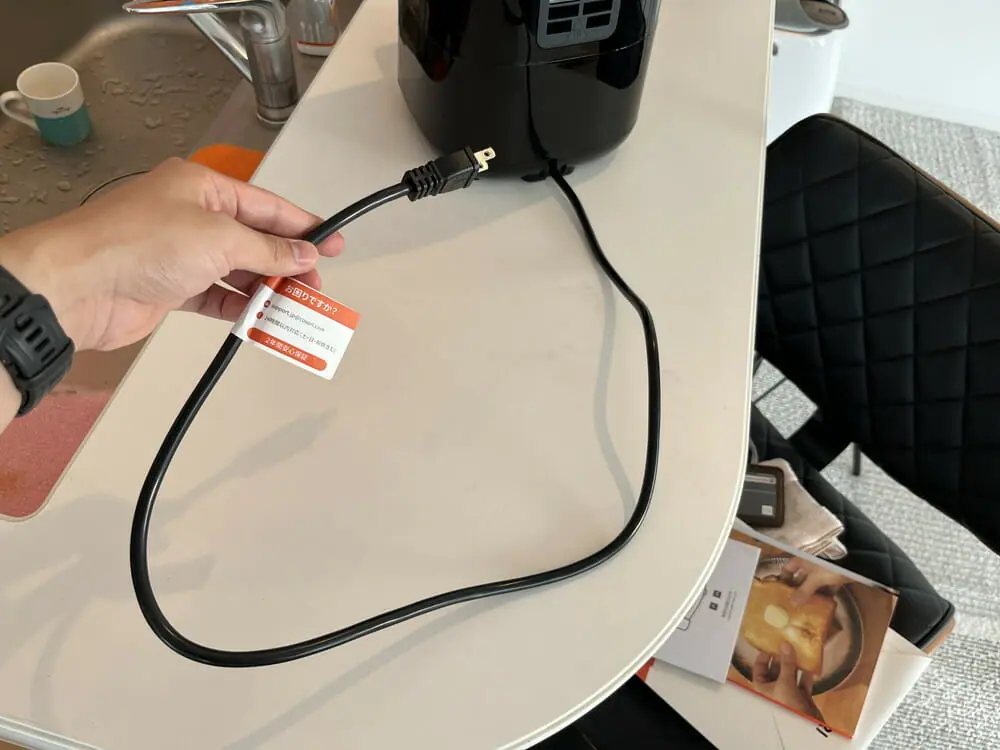 まずノンフライヤー本体背面から伸びる電源コードをコンセントに接続する。