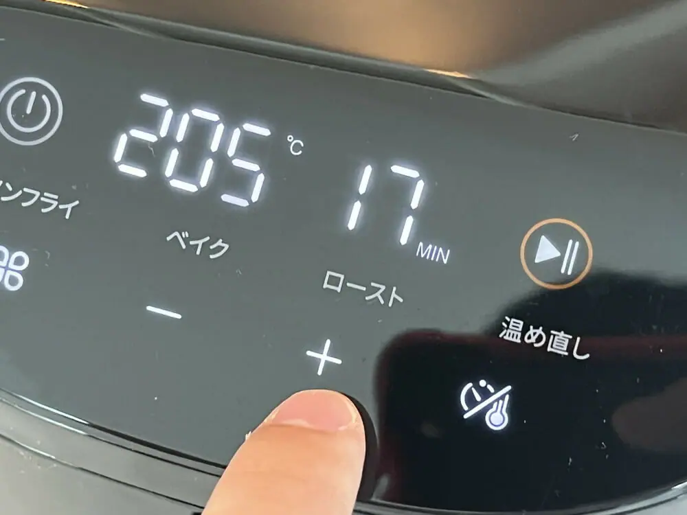 ▼加熱温度および時間も、プラス(+)マイナス(-)ボタンをタップすることで、温度に関しては1度単位で75度~205度、時間は1分単位で1分~60分のあいだで調節することが可能だ。