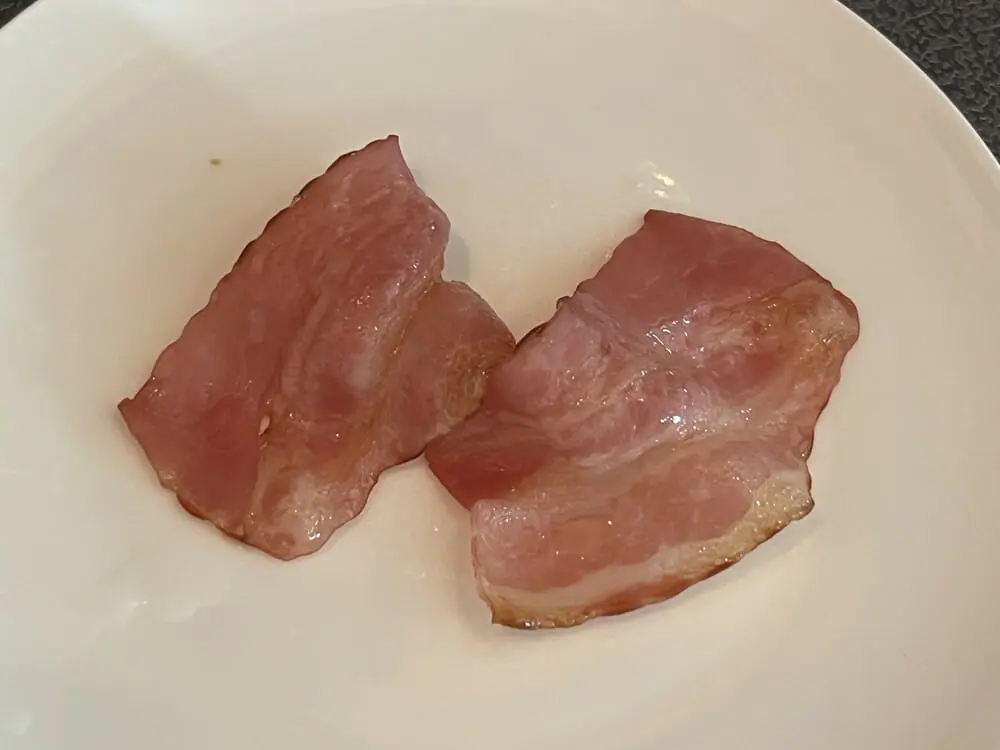 まるで高級ホテルのブッフェで用意されるベーコンのように、非常にカリカリに仕上がっていた。フライパンで加熱した場合とはまるで別物の出来だ。