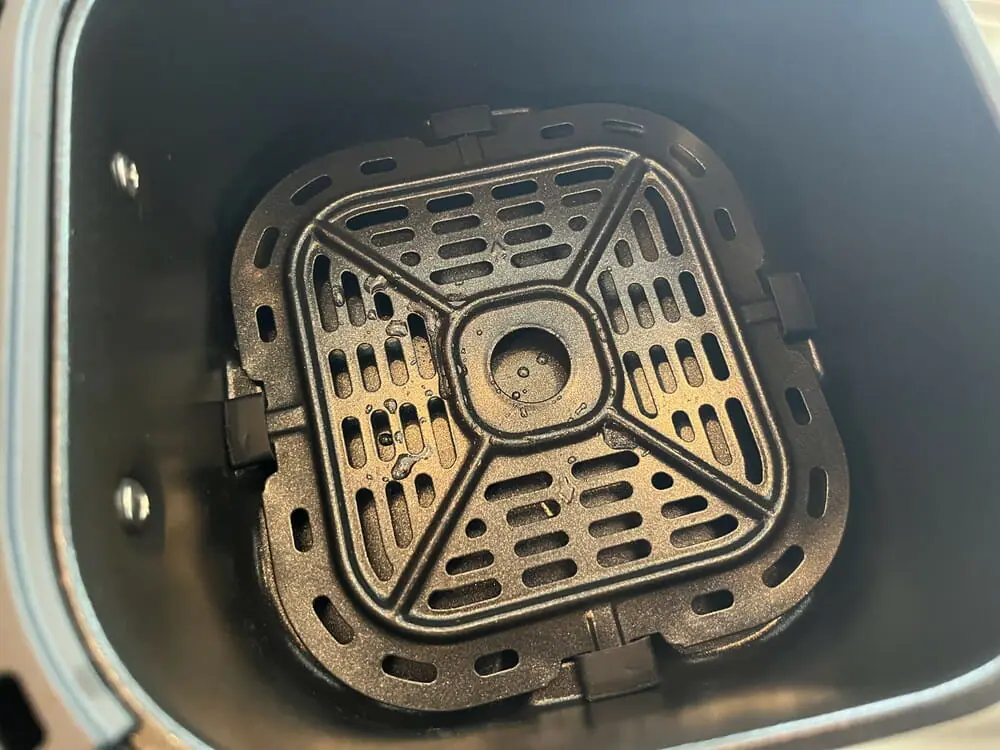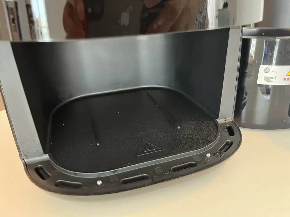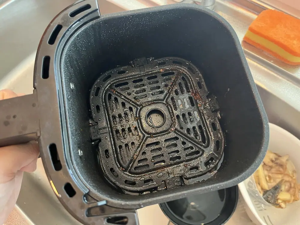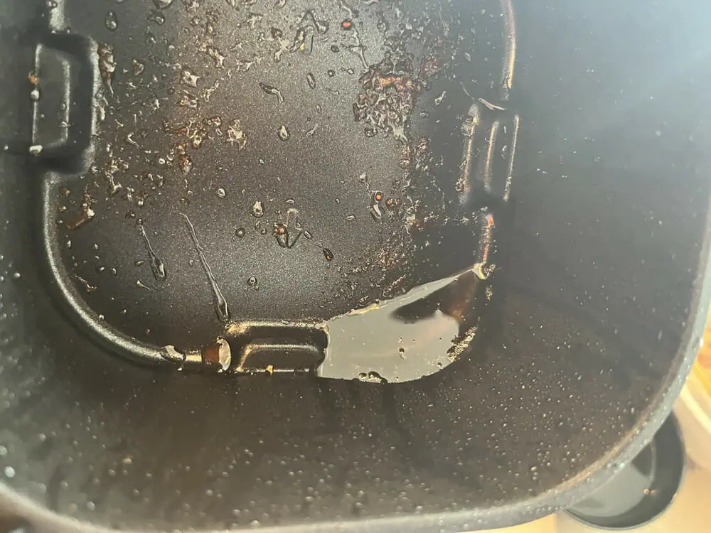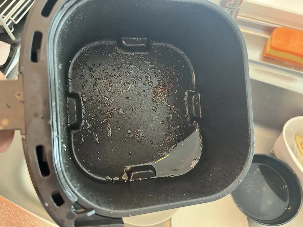 ▼ベーコンを調理した後のバスケット内部。プレートにベーコンから抽出された脂がプレートに付着しているのが分かる。