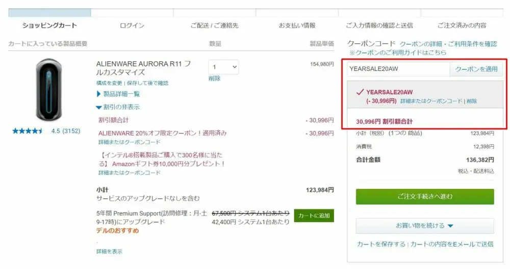 ※クーポンコードを適用せずに購入手続きを完了してしまうと、割引対象外となるので注意してください。