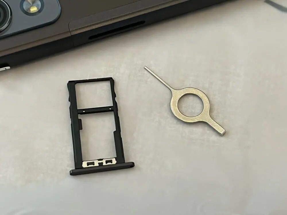 ▼付属のピンを用いてスロットを開き、マイクロSDカードおよびnanoSIMカードを挿入することが可能だ。