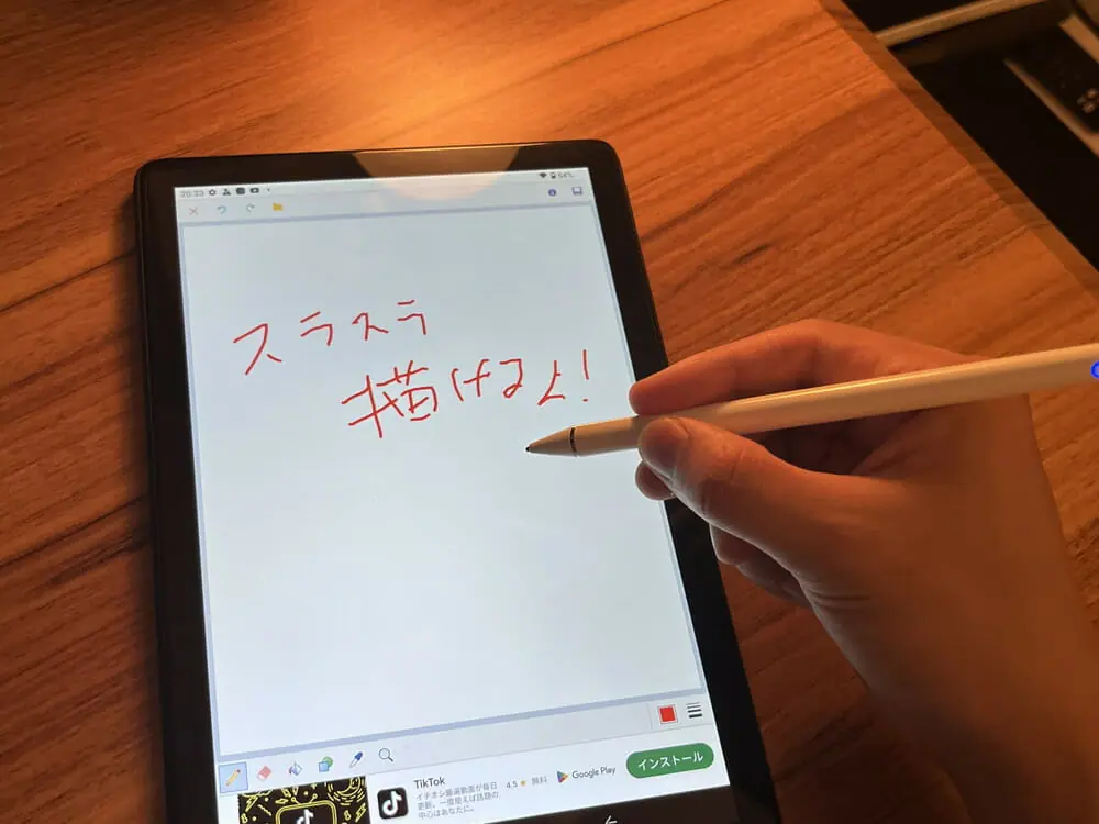 スタイラスペンを利用することで、タブレット上のお絵かきアプリなどへ直接書き込んだり、メモ帳アプリに手書き調のメモを残すことができる。