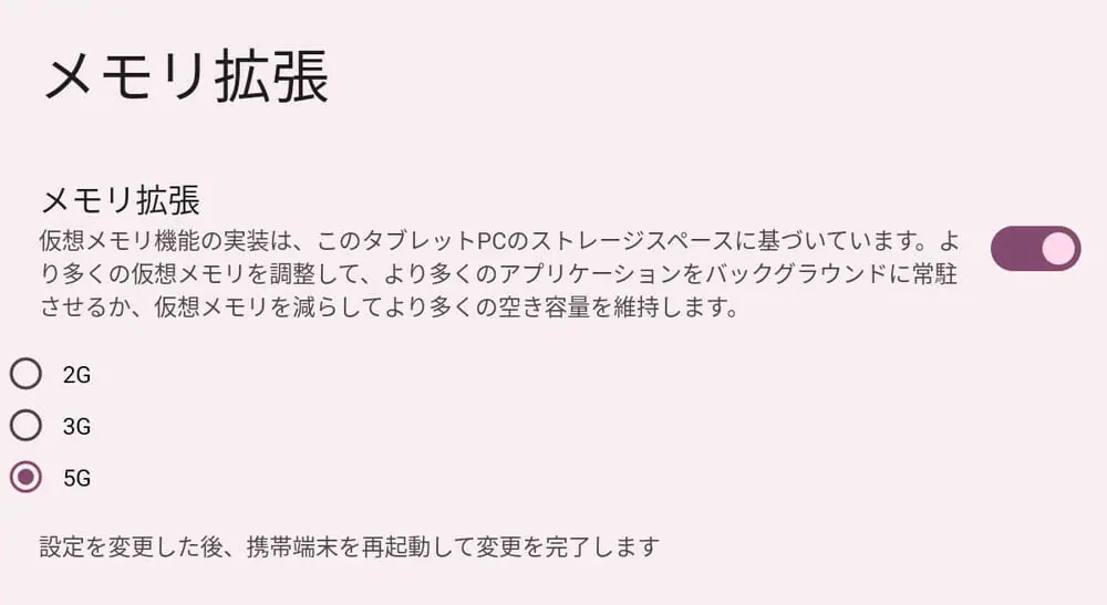 ▼ちなみに、設定アプリより最大5GBまでの仮想RAM拡張を行うことが可能だ。