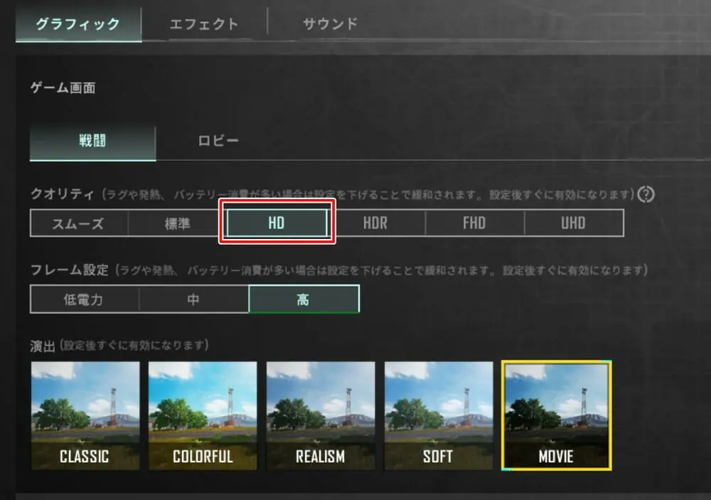 まずグラフィッククオリティに関しては『HD』まで選択出来た。