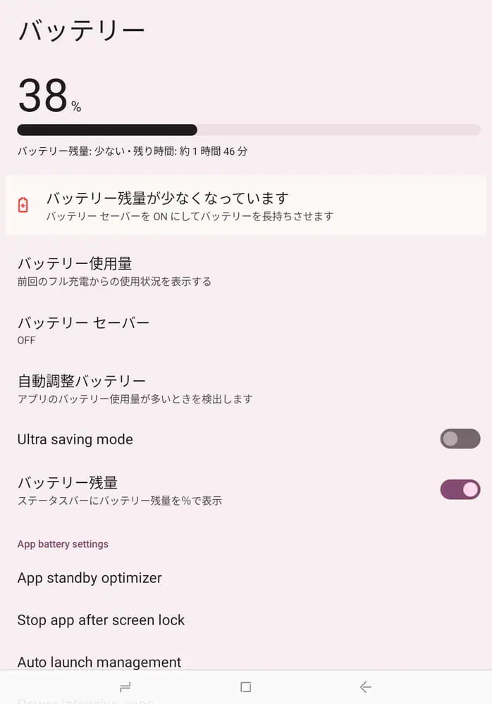 実際に100%の満充電状態から4~5時間ほどゲームアプリをプレイしてみたところ、まだ40%近い残量があった。