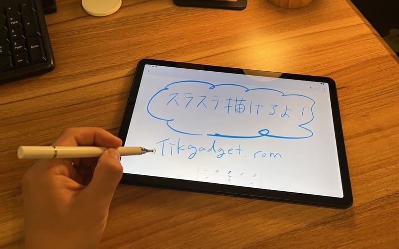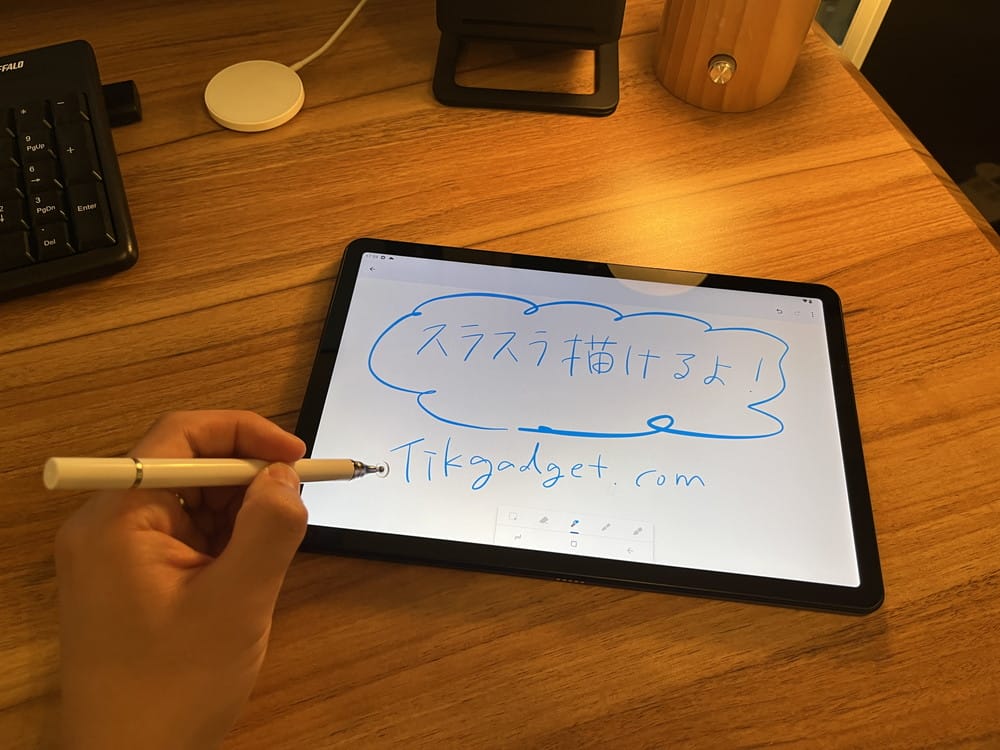 スタイラスペンを利用することで、タブレット上のお絵かきアプリなどへ直接書き込んだり、メモ帳アプリに手書き調のメモを残すことができる。正直、ペンの感度や入力精度は最低限レベルだが、普段紙に描いている場合と同様の、直感的な感覚でメモ書きを行うことが可能であった。