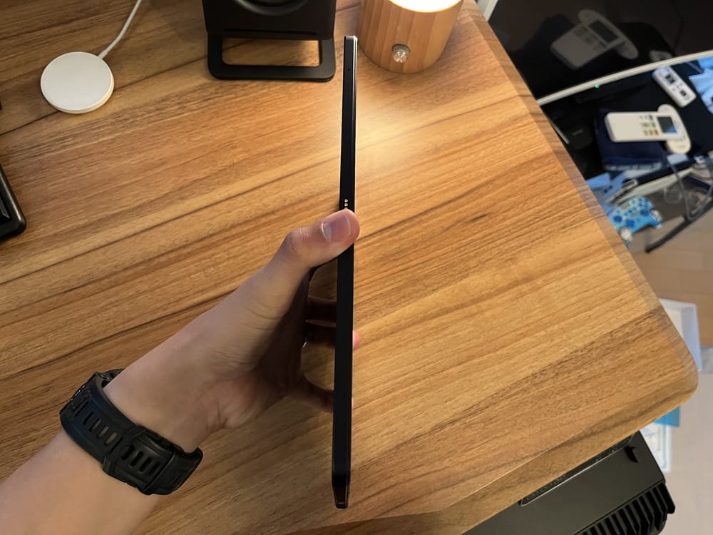 ▼厚みは7.6mmと薄い。カバンなどに入れて持ち運んでも支障にならないだろう。