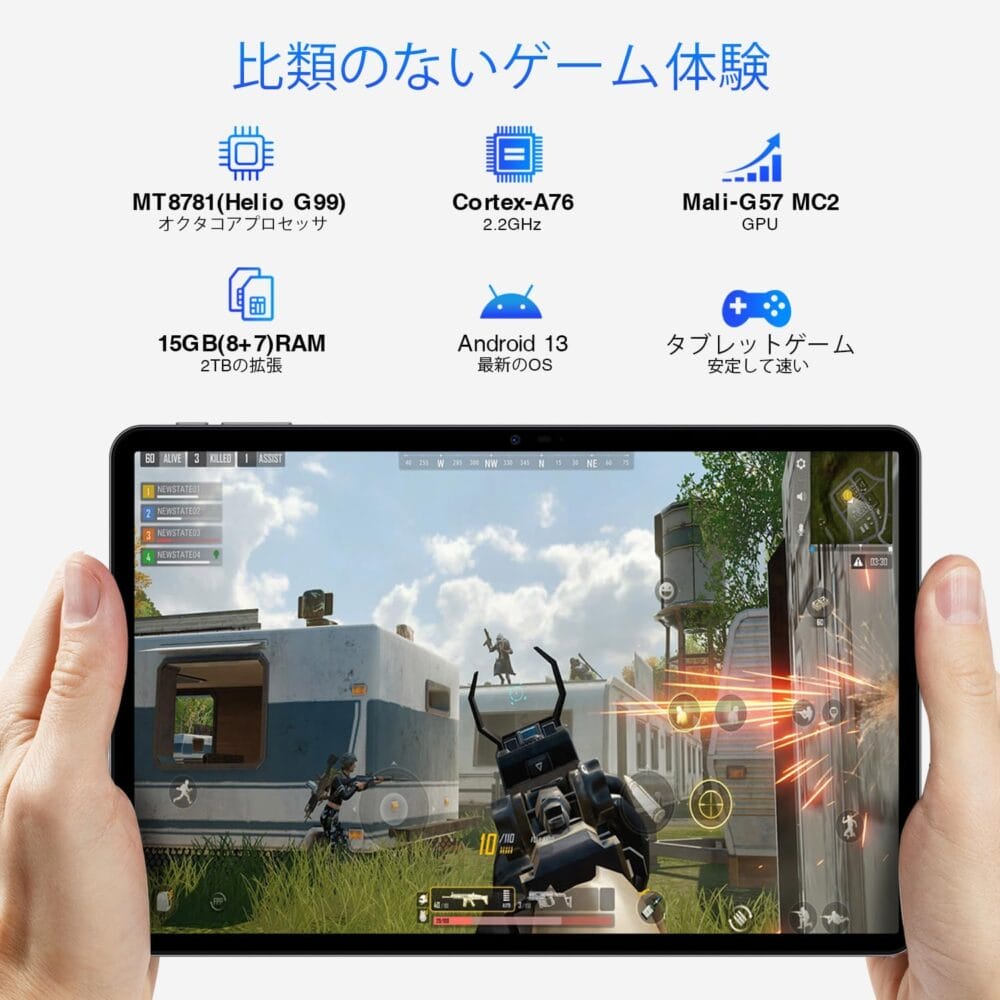 11インチディスプレイを搭載した大型のAndroid13タブレットであり、Helio G99 オクタコアプロセッサーを搭載、最大15GBまで拡張可能なRAMを搭載するなど、3万円台前半の価格に対して優れたパフォーマンスを発揮する高性能タブレットとなっている。