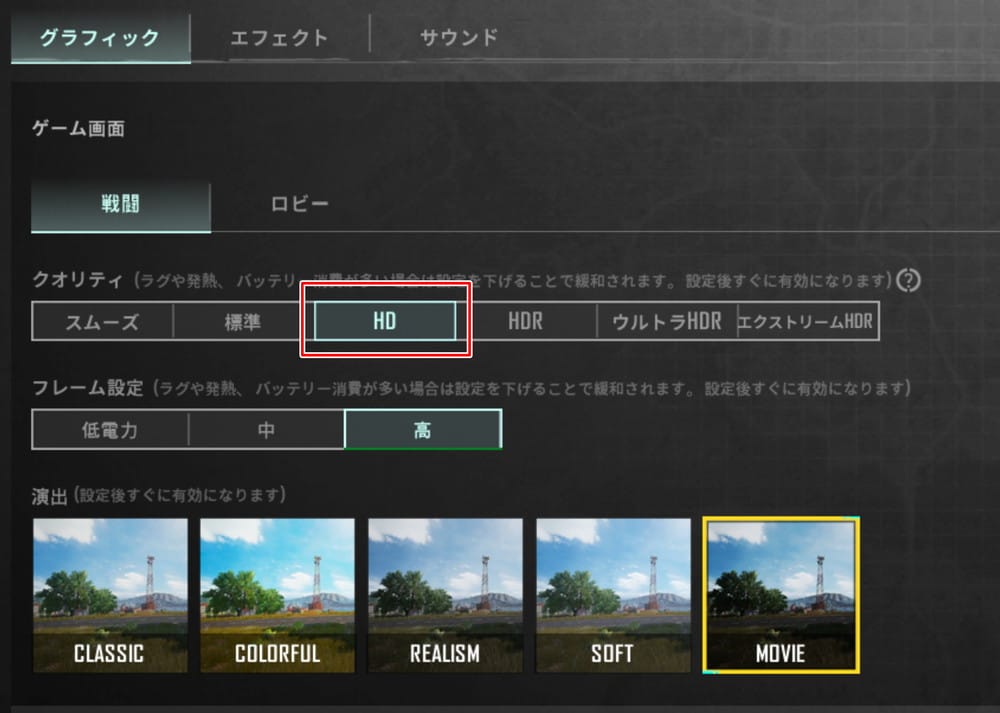 まずグラフィッククオリティに関しては『HD』まで選択出来た。