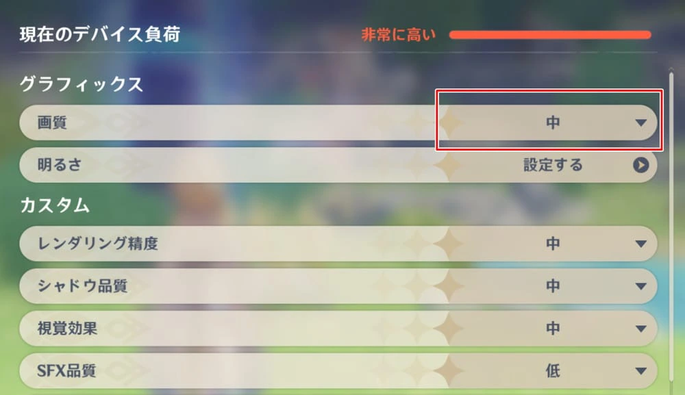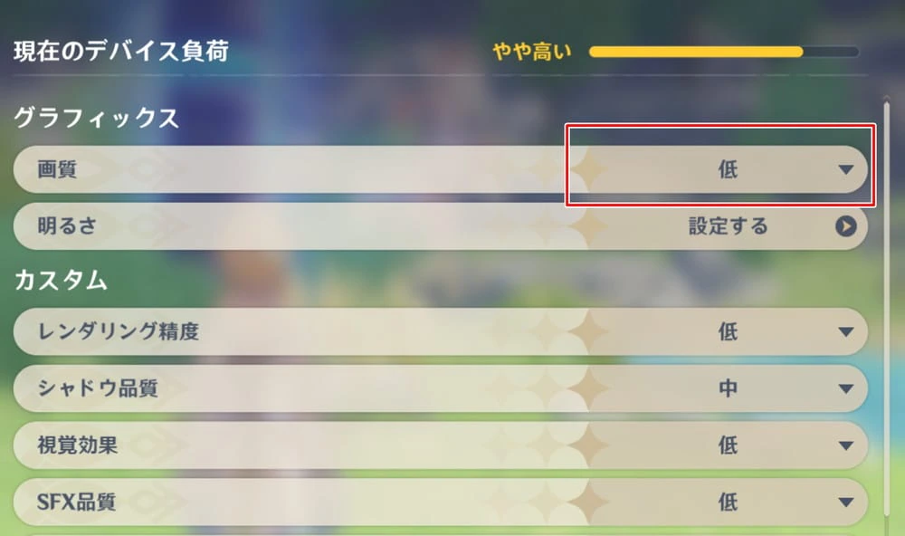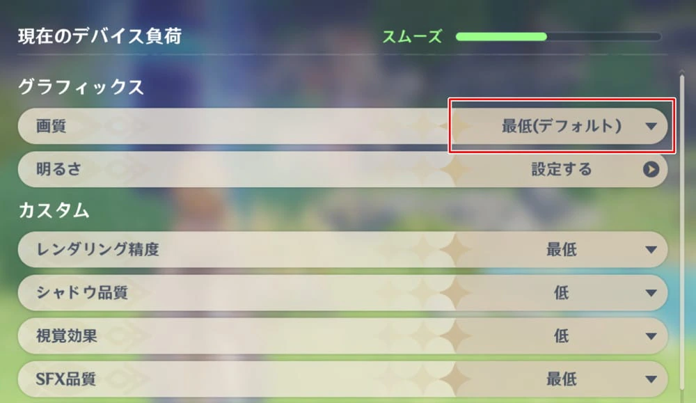 ▼ "低" に上げるとデバイス負荷が高まり、多少フレームレートが低下するが、比較的スムーズなゲームプレイが可能であった。