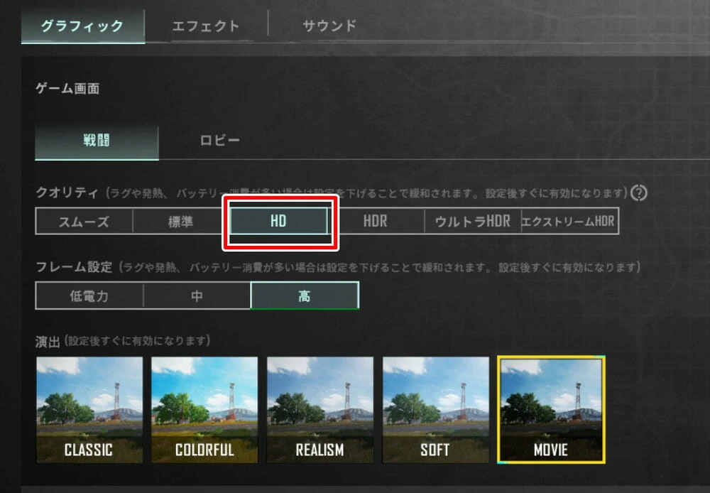 まずグラフィッククオリティに関しては『HD』まで選択出来た。