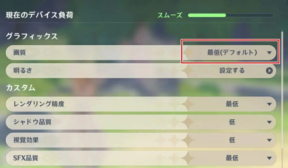 画質設定はデフォルトで "最低" に設定されている。