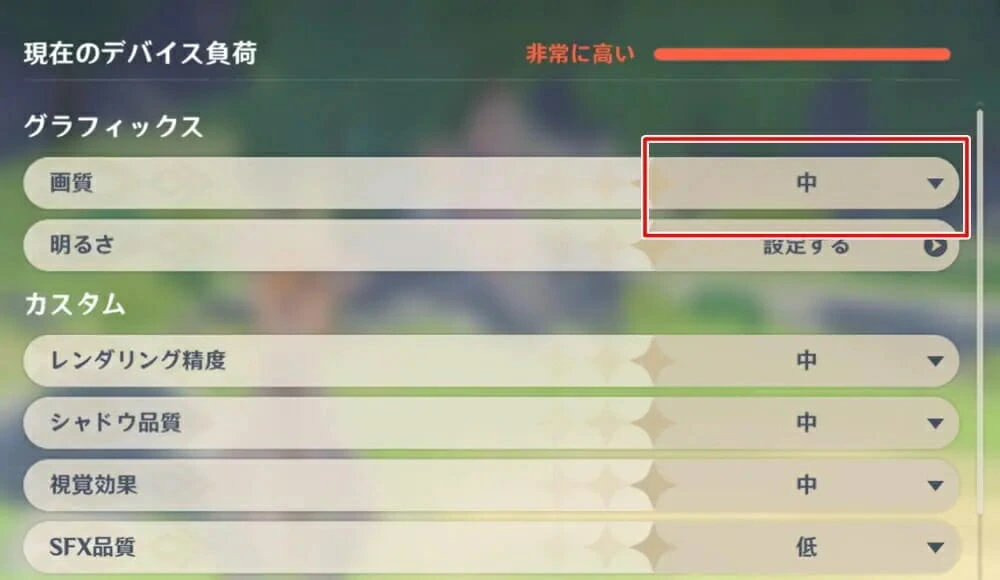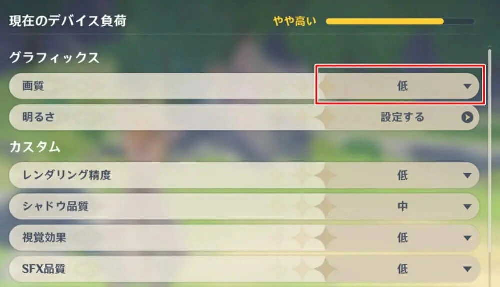 ▼ "低" に上げるとデバイス負荷が高まり、フレームレート低下が発生するようになる。