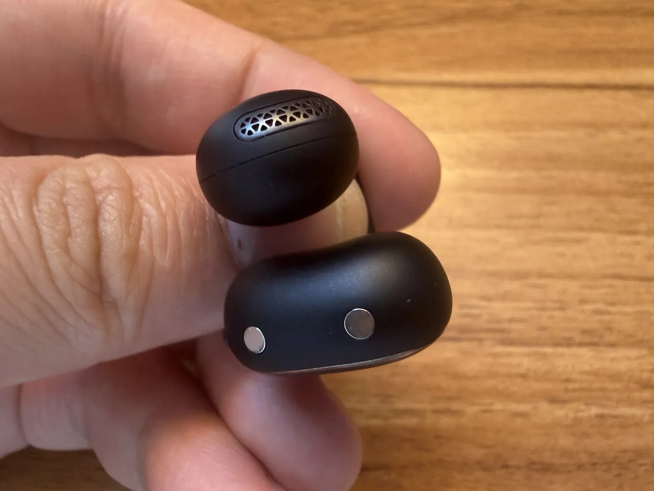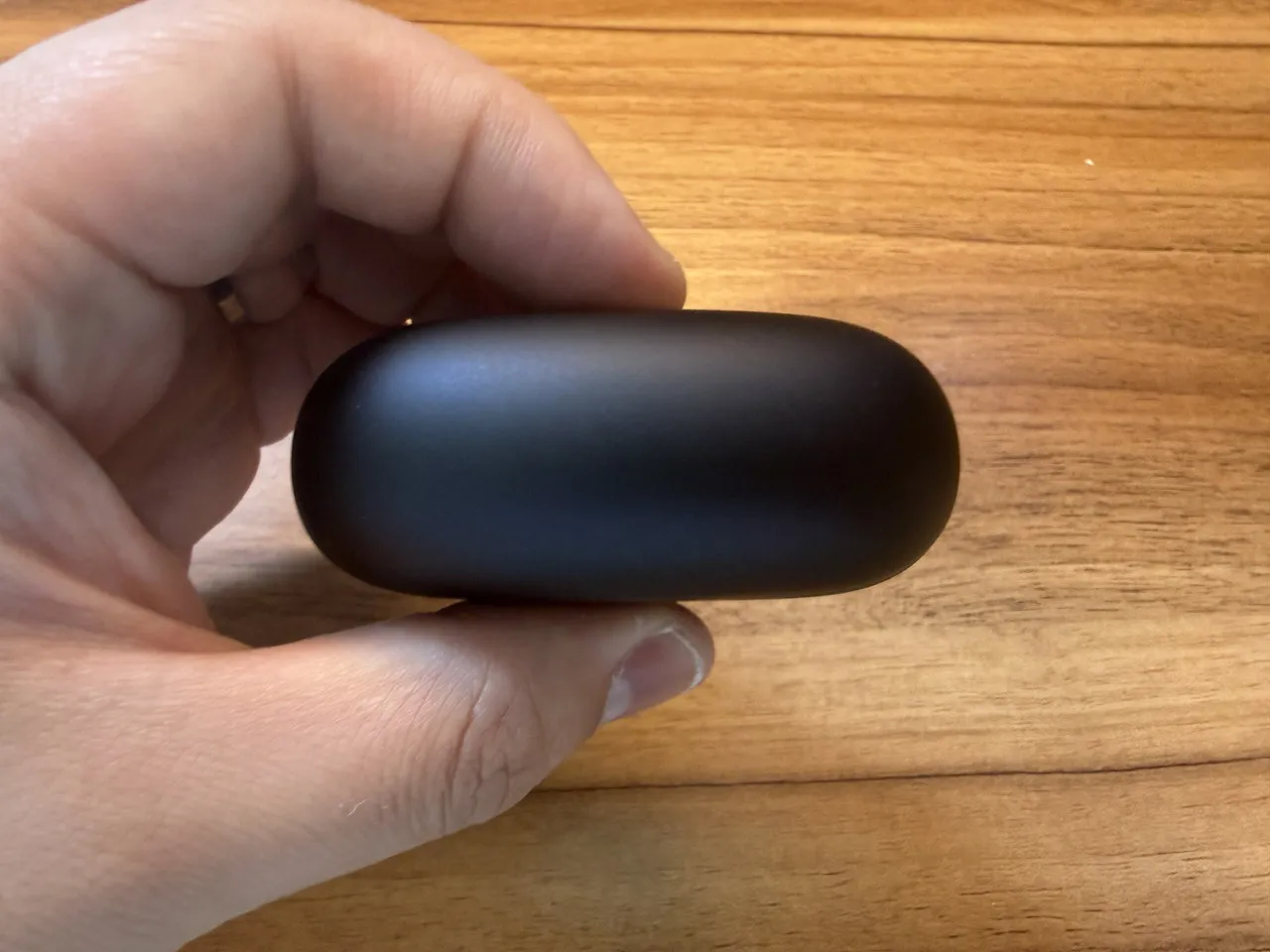 イヤホンのフォルム自体は、一般的なイヤーカフ型と大差ありません。充電ケースと同様に、マットな表面仕上げで落ち着いた感じがあります。