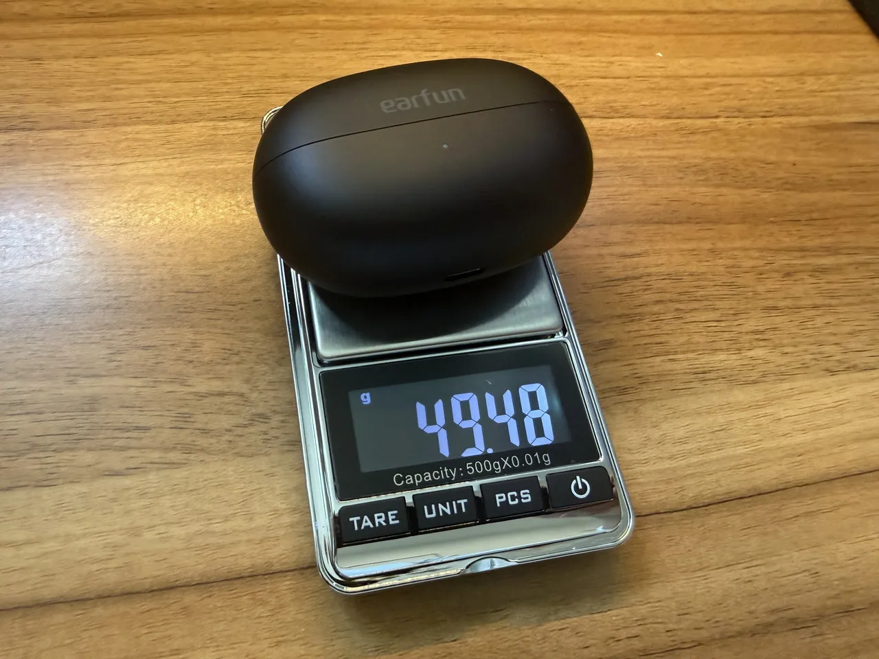 ケース&イヤホン込みの総重量は、実測で約49.48gと軽量。