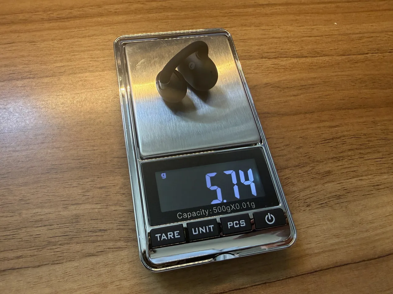 イヤホン単体(片耳)は、実測で約5.74gと軽量。