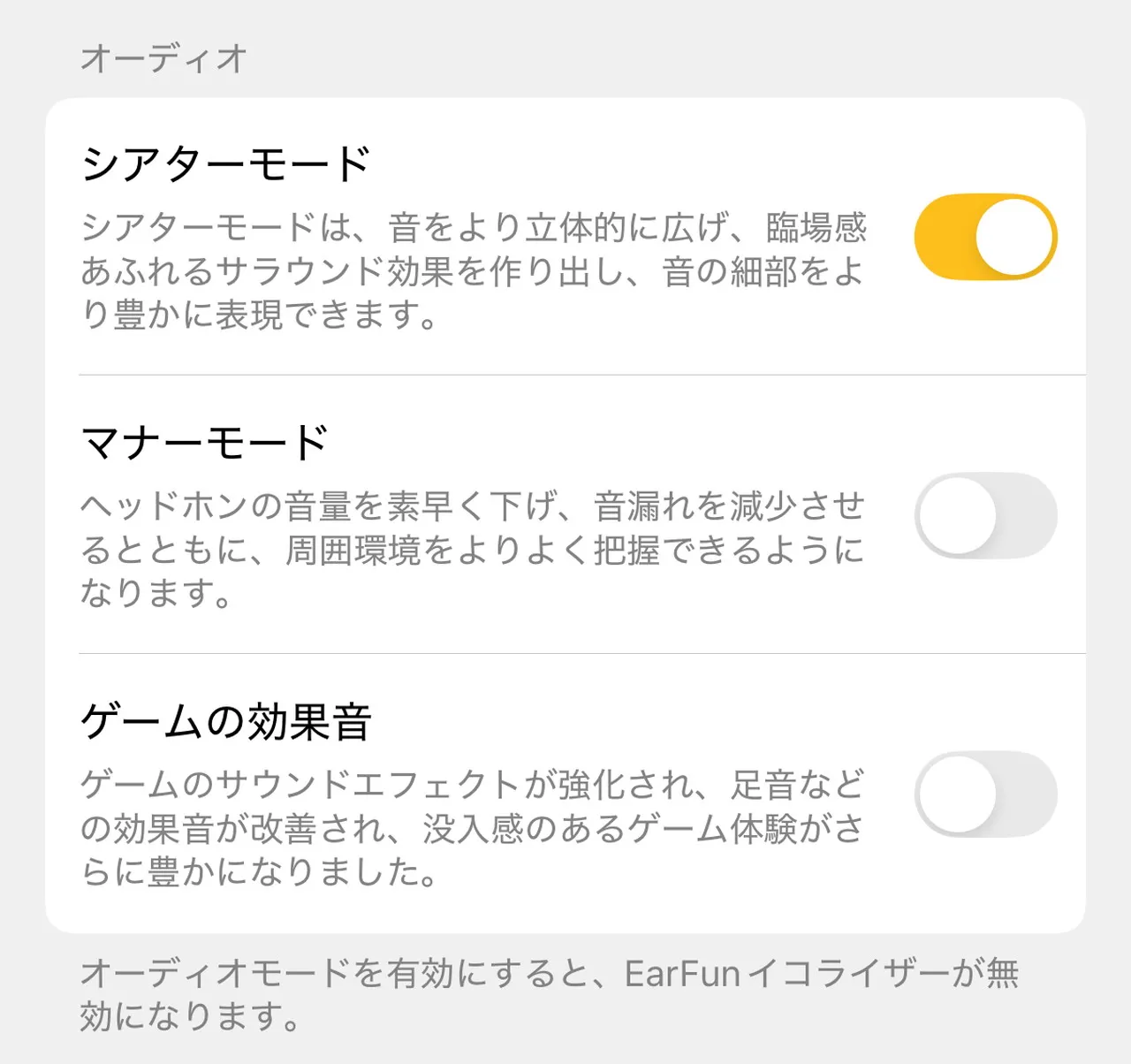 そして「シアターモード」「マナーモード」「ゲームの効果音」の3種類のオーディオモードも選択できます。特にシアターモードをオンにすると、音の広がりや立体感を強めることができ、映画やライブ映像では臨場感が高まるのを実感できました。