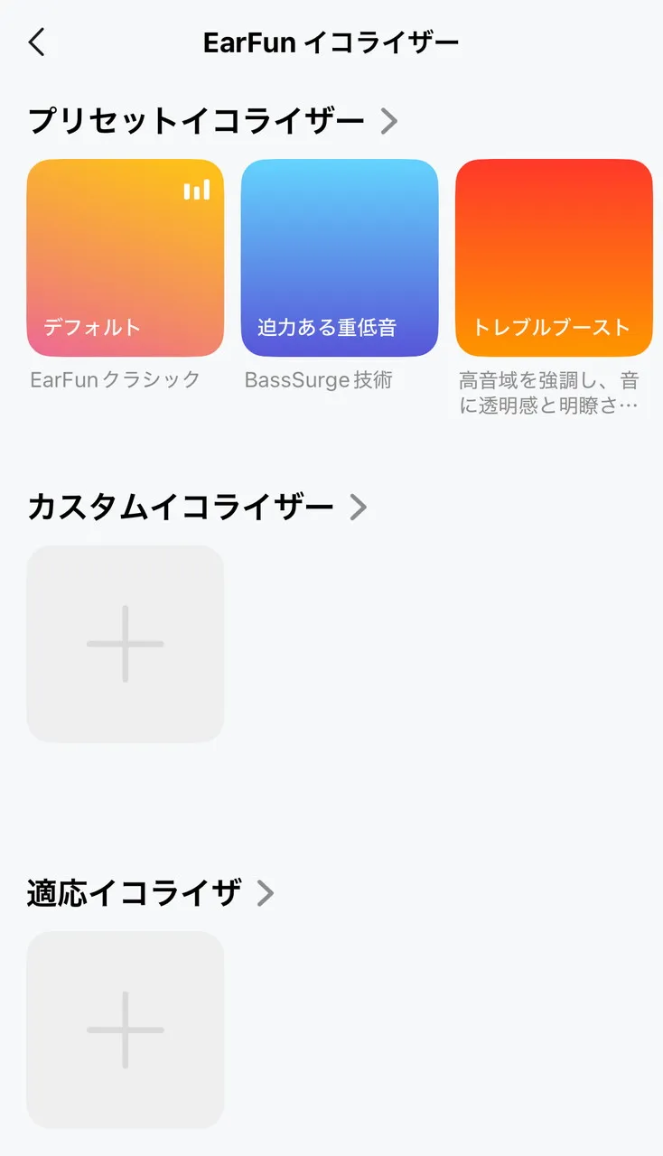 また、手動で調整できる「カスタムイコライザー」や、視聴環境に応じて最適な音質を実現しやすい「適応イコライザー」も用意。楽曲ジャンルや視聴用途に合わせて音を調整しやすく、自分好みの音を見つけやすいのは本機の大きな魅力だと思います。