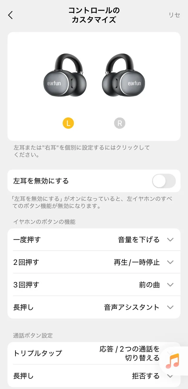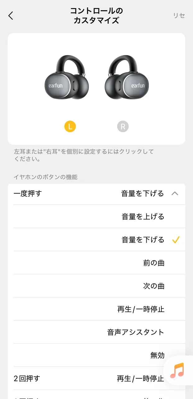 両側のイヤホン本体には操作ボタンが用意されており、ワンクリック、ダブルクリック、トリプルクリック、長押しといった各操作に対して、アプリから好みの機能を割り当てられます。