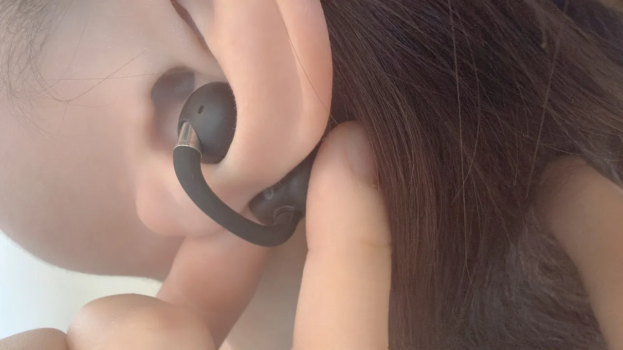 本機は超ソフトシリコンと0.5mmのニッケルチタン形状記憶合金を採用しており、耳に当たる感触が柔らかめです。実際、装着した瞬間に強い圧迫感を覚えにくく、イヤーカフ型にありがちな「挟まれてる感」も控えめでした。