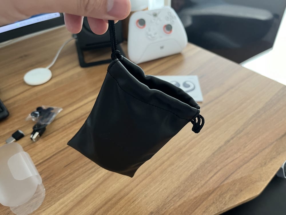 ▼ポーチが付属しており、充電ケースを含めた付属品一式を収納して持ち運べる。