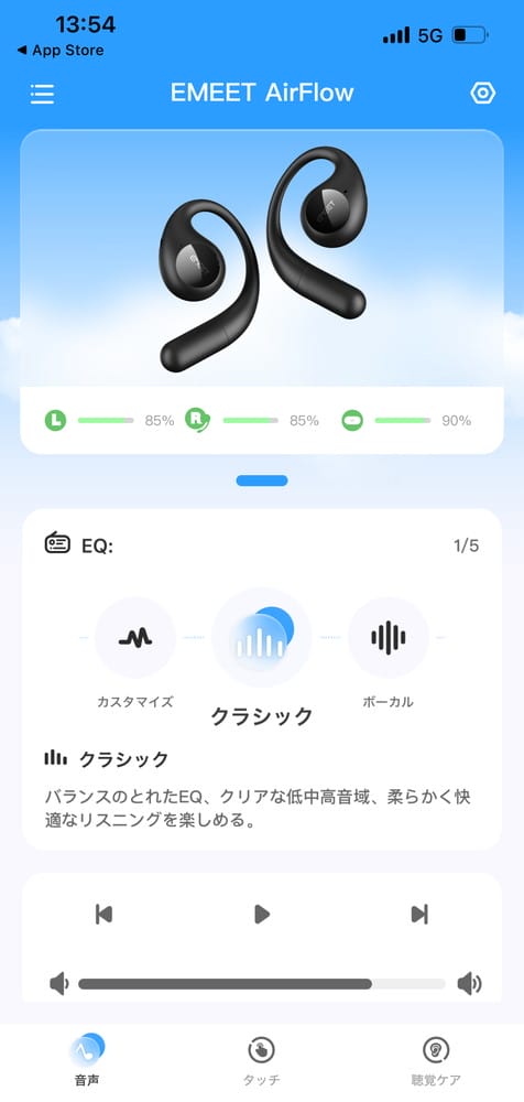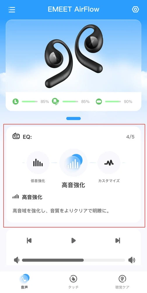 ▼アプリ画面。イヤホンの充電残量や接続状態、音質に関する各種パラメータの調節などを行うことが可能。