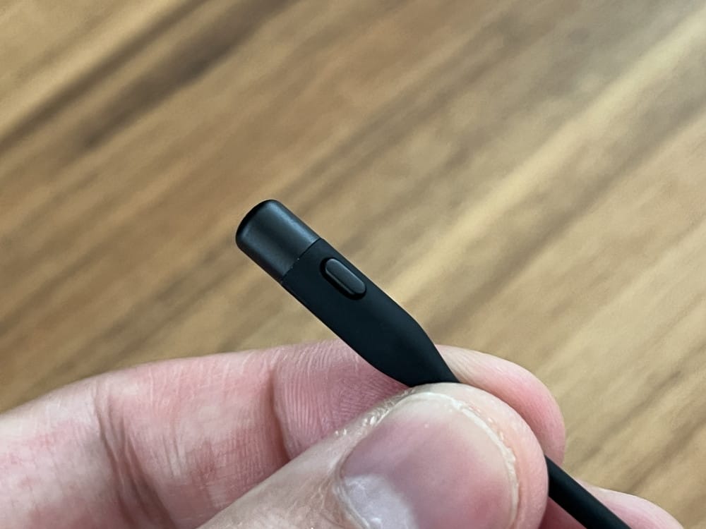 ▼マイクブームを接続した様子。左右いずれのイヤホン側にも接続できる点が嬉しい。