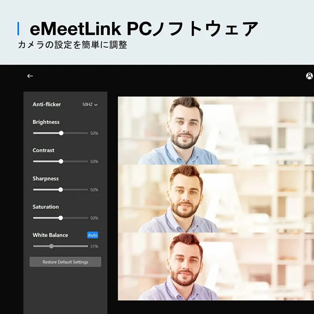 さらに無料のeMeet Linkソフトウェアで、 ウェブカメラの各パラメーター調整やファームウェアアップデートなどを行うことが可能。利用用途に合わせて、映像品質等を自由に設定可能だ。