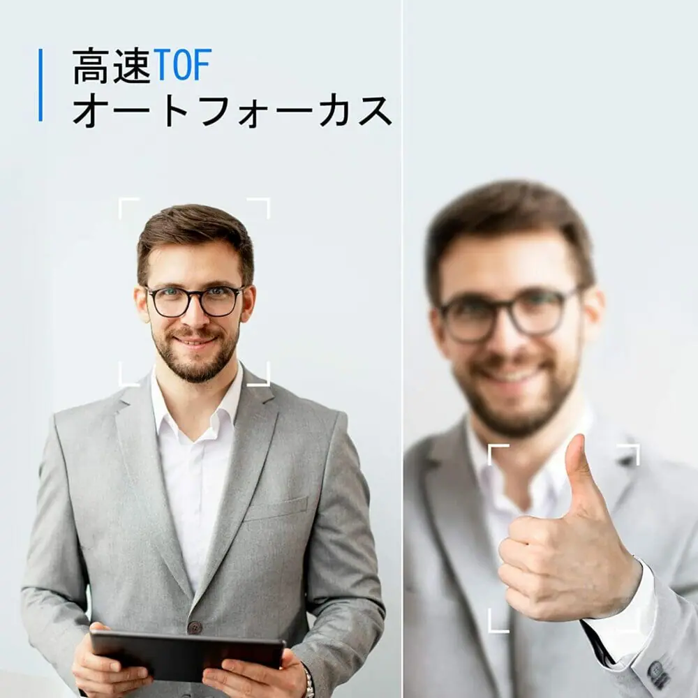「TOFオートフォーカス機能」を搭載。光や環境条件に関係なく、常に正確かつ素早くフォーカスを合わせることができる。また「自動ローライト補正技術」と「露出調整機能」を搭載しており、薄暗い場所でも明るい場所でも、常にクリアな映像をキャプチャすることが可能となっている。
