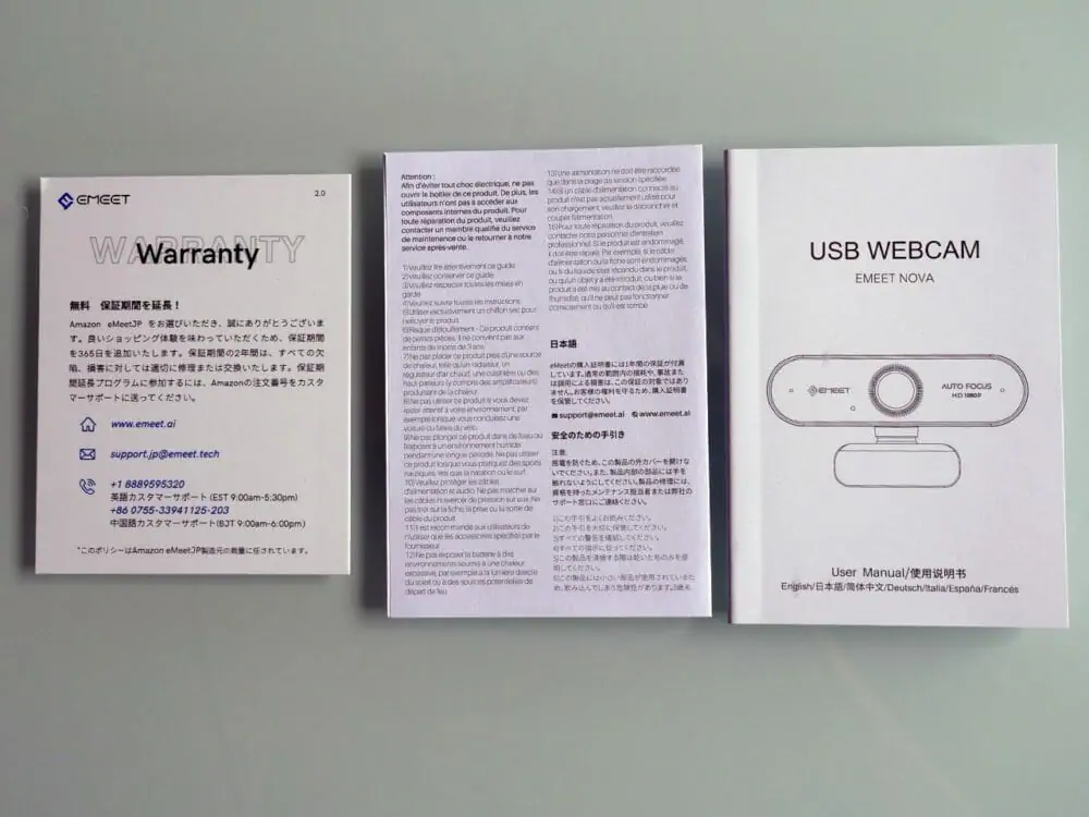 eMeet NOVAは、USBで接続するだけのWEBカメラです、パッケージはカメラ本体とマニュアル類だけが入っているシンプルな構成です。