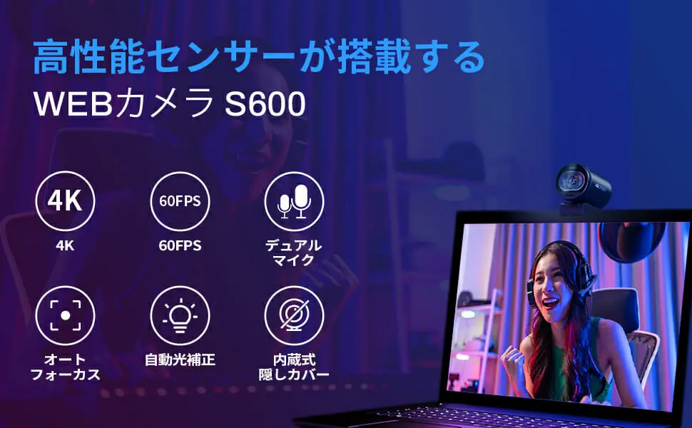 4K・30fps対応の高性能ウェブカメラであり、美しく滑らかな映像を相手側に届けることが可能。デュアルマイクを内蔵しているため、これ1台でウェブ会議やオンライン授業の環境を整えることが出来るモデルとなっている。