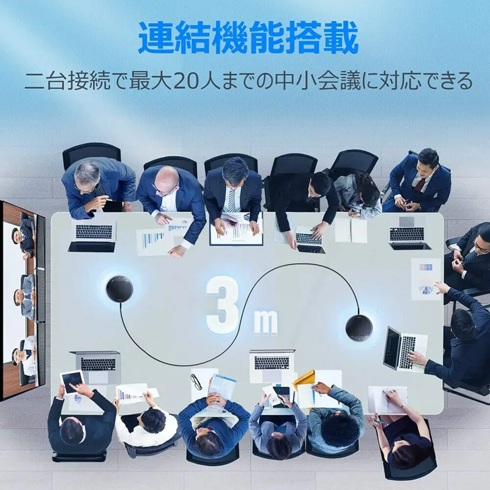 本製品は連結機能に対応しており、同モデルを専用連結ケーブルで2つ接続することで、最大18名までの参加者に対応できるようになる。この機能は、Luna Plus, M0 Plus, M3, Meeting CapsuleなどのEMEET製品に対応しており、小規模な会議から大規模な会議まで柔軟に対応させることが可能だ。