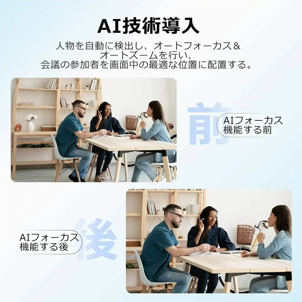 AI機能を搭載しており、会議参加者の動きを検知して、自動でフォーカス調整やズームイン・アウトなどの調節が行われます。