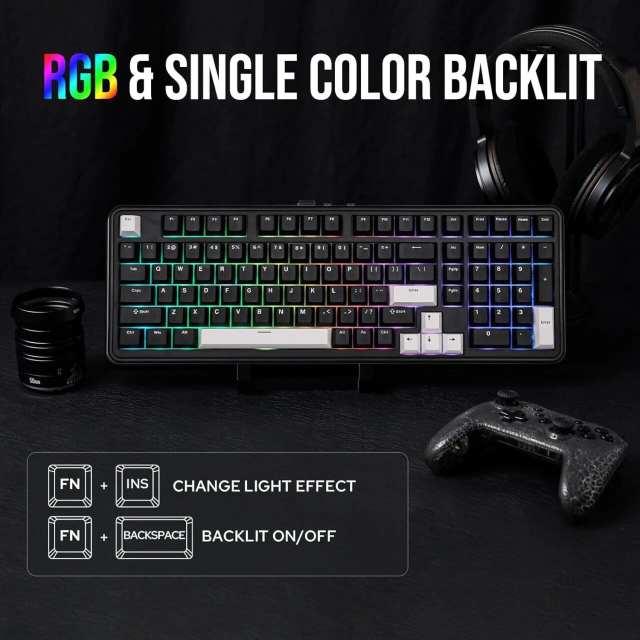 US配置の102キーを備えた、1800コンパクトレイアウトのメカニカルキーボードだ。有線(Type-C)、2.4GHzワイヤレス、Bluetooth 5.0の3種類の接続方法をサポートしており、幅広いシーン・用途で活用できる。