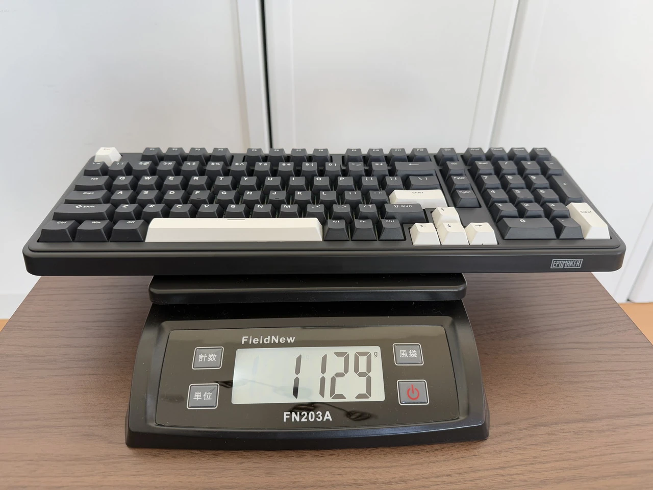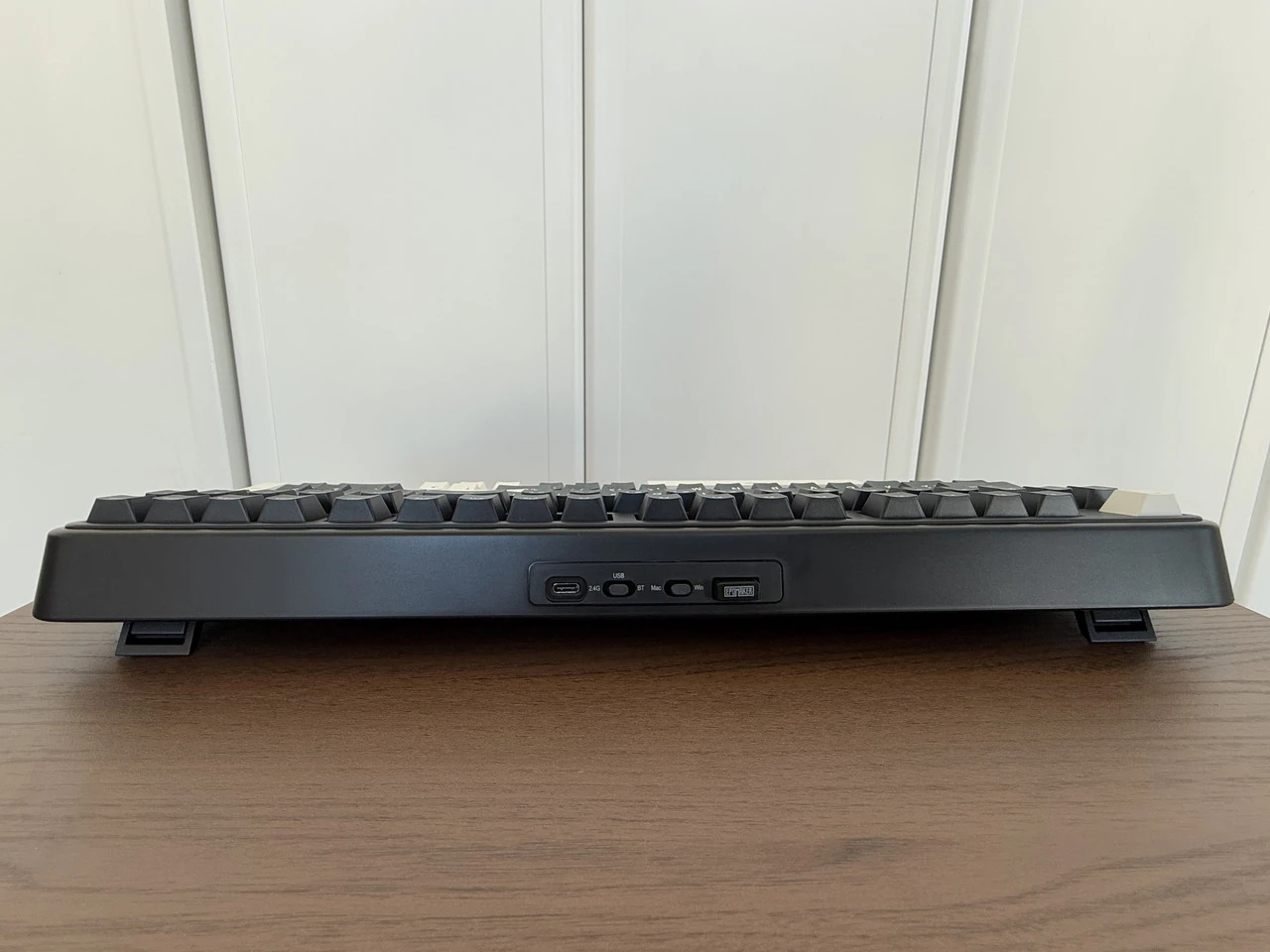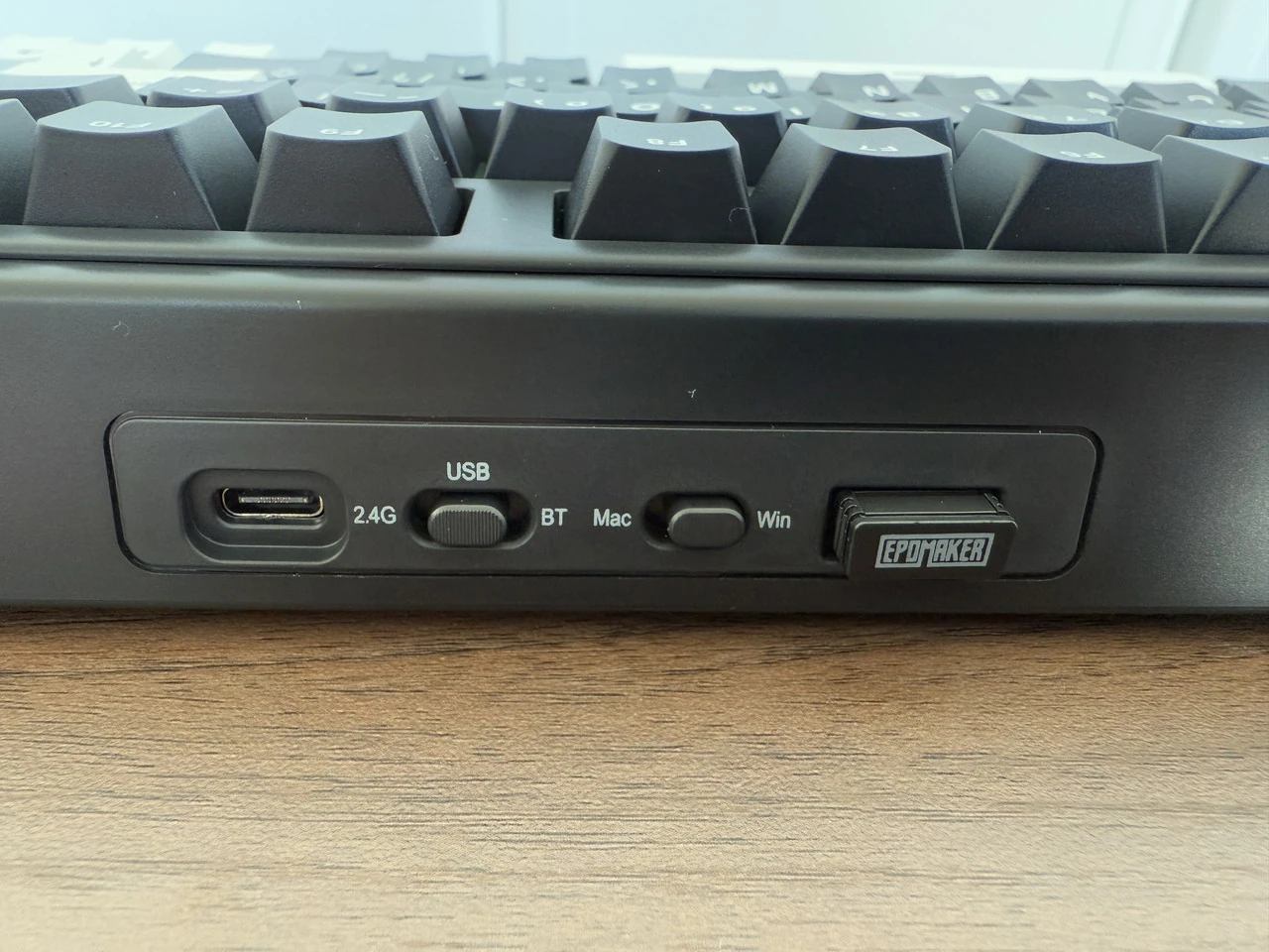 1800レイアウトを採用しており、102キーを備えつつ、全長が比較的コンパクトなサイズに収まっている。有線(Type-C)、2.4GHzワイヤレス、Bluetooth 5.0の3種類の接続方法をサポートしており、特に2.4GHzワイヤレス接続時には、入力遅延を犠牲にすることなくケーブルレス使用できるため、デスク上をスッキリとさせることができて嬉しい。